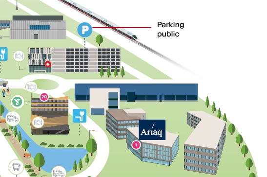 Un parking payant se trouve à 450m d’Ariaq et propose plusieurs centaines de places.